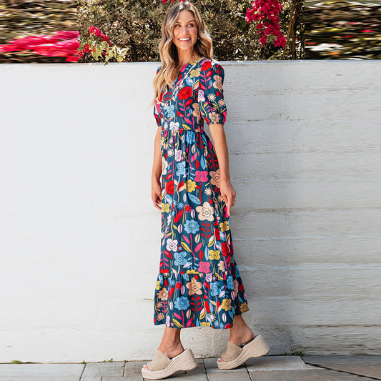 Vintage Floral Print Slim Fit Long Dress Women's Clothing